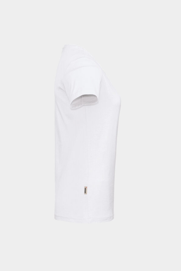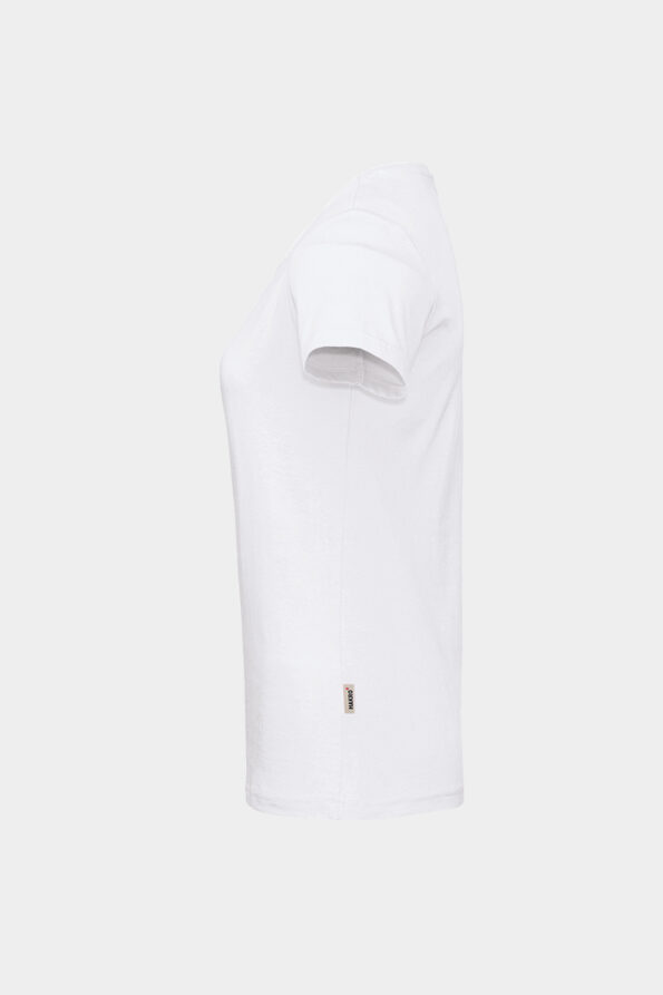 Modisch geschnittenes T-Shirt für Damen mit rundem Halsausschnitt, schmalem Bündchen und Nackenband. Hergestellt aus feinem, mittelschwerem Single-Jersey aus langstapeliger, gekämmter und ringgesponnener GOTS-zertifizierter Bio-Baumwolle. Gewebtes HAKRO-Necklabel aus hochwertigem Kettsatin mit weichen, ultraschallgeschnittenen Bandkanten für höchsten Tragekomfort und gewebtes HAKRO-Flaglabel an der linken Seitennaht.
